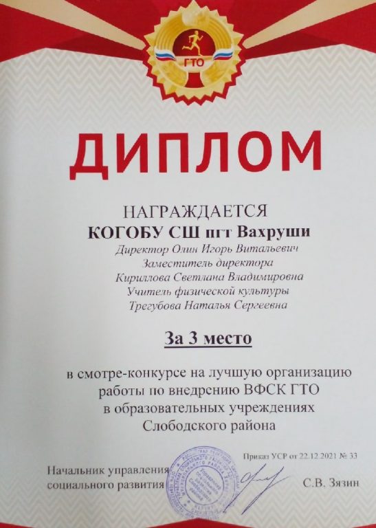 В коллекции школьных наград за работу по направлению ГТО в этом году добавился диплом за 3 место в Слободском районе и подарочный сертификат на 3 тыс. руб.